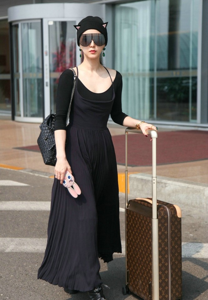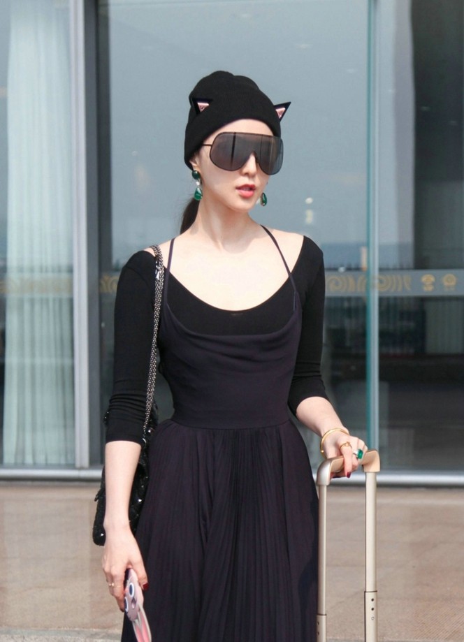 这组照片拍摄于2016年10月,正值范冰冰演艺事业与时尚影响力的巅峰时期。机场对于她而言,早已不仅是交通枢纽,更是展示个人时尚品味与明星气场的重要舞台。此次选择的超大镜面镭射墨镜,是当时欧美时尚圈风头正劲的单品,其镜面反射效果未来感十足,既能巧妙遮挡旅途疲惫,又能营造出一种疏离而强大的视觉氛围。墨镜夸张的尺寸与她精致的脸型形成鲜明对比,在凸显小脸优势的同时,更强化了造型的戏剧张力和时尚态度。