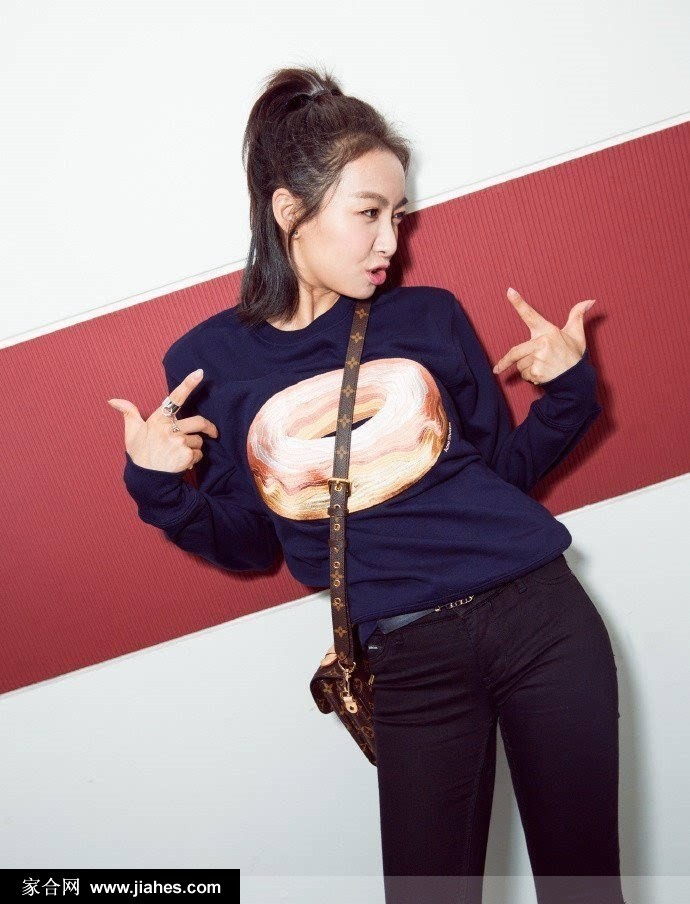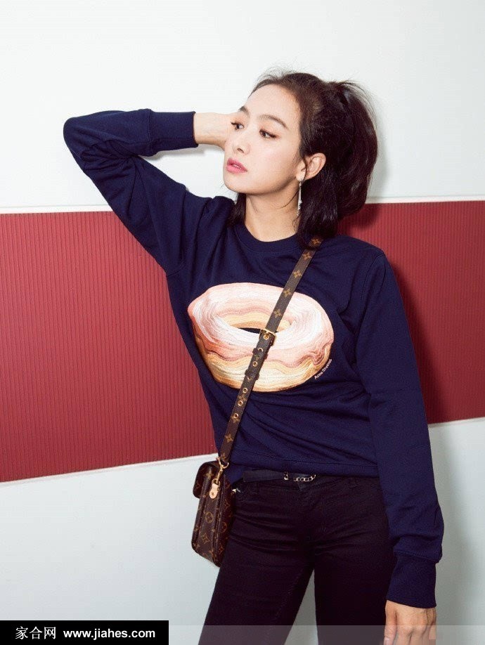 这组写真的核心单品,是一件来自Acne Studios的深蓝色卫衣,其上印有醒目的甜甜圈图案。这个充满童趣和甜味的元素,瞬间奠定了整体造型活泼、有趣的基调。与她在其他场合演绎的“萝莉风”连衣裙不同,卫衣自带一种随性、舒适的街头感。宋茜用黑色紧身裤和厚底短靴进行搭配,不仅勾勒出她优越的长腿线条,更在可爱中注入了利落与帅气的因子,完美平衡了甜度,避免了过于稚气,这正是当下流行的“甜酷风”精髓。她手中拎着的LV包包则为这身休闲装扮增添了一抹精致的奢华感。